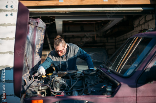 A man repairs a car, opens the hood