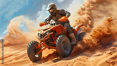 A man riding an orange paint colored four wheeler, in the desert, kicking up dust as he rides fast through sand dunes. The wind is blowing and creating shadows on his face.