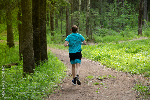A man runs in the woods . Fitness classes in the forest.