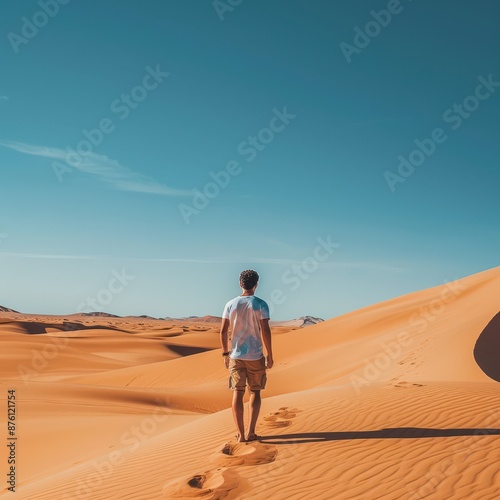 A man seen from behind, walking through a desert landscape, dynamic pose, panoramic view