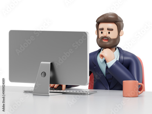 A man sits at a desk, laptop open, hand on cheek, symbolizing deep thought or problem-solving. 3D rendering, conceptual image. Isolated on white background.