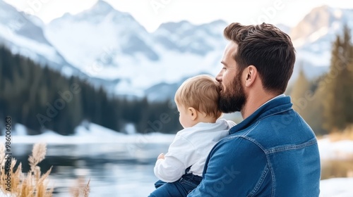 A man sits with a baby on his knee, gazing at a tranquil lake with snow-covered mountains in the background, displaying a peaceful moment of reflection in nature's beauty.