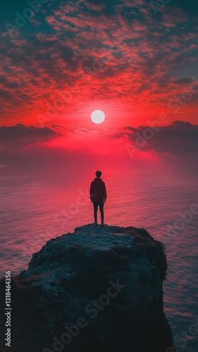 A Man Standing on a Cliff Overlooking the Ocean at Sunset