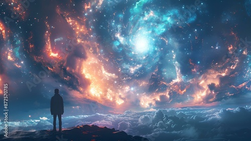 A man standing on a mountain peak, gazing at the sky.