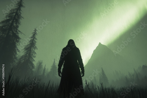 A man stands in a forest with a hooded cloak on