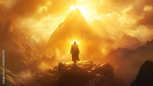A man stands on a mountain top, looking up at the sun