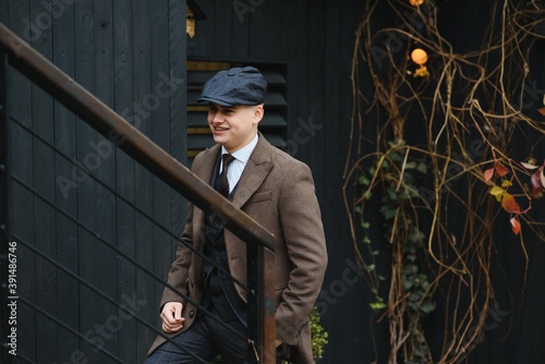A man walks at city street in the image of an English retro gangster of the 1920s dressed in Peaky blinders style.