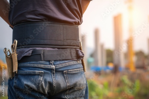 A man wearing a back support brace while engaged in construction work. He is focused on his tasks at a construction site.