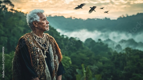 A man wearing a black jacket and a red and brown vest stands in a forest