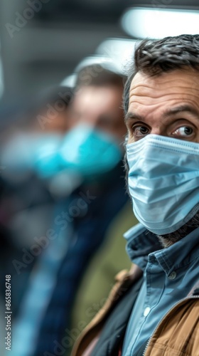 A man wearing a face mask looks sideways in a crowded indoor setting, illustrating the importance of health precautions during a pandemic.