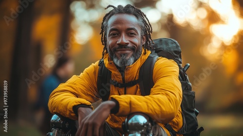 A man wearing a prosthetic leg smiles confidently in a park surrounded by friends. Demonstrate flexibility and strength moving forward.