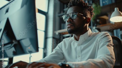 A man wearing glasses is sitting at a desk in front of a computer monitor