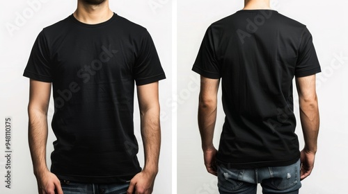 A man wears a plain black t-shirt, front and back, for a t-shirt design mock-up