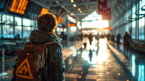 A man with a backpack standing in an airport Portrait of the man standing at the airport, providing a glimpse into the man's journey ahead.