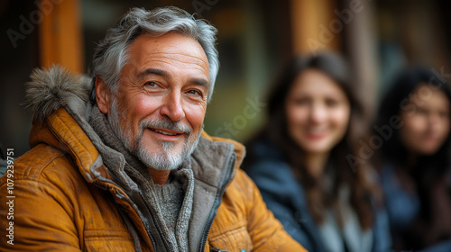 A man with a beard and gray hair is smiling at the camera. He is wearing a yellow jacket and a scarf. A woman is sitting next to him, and another woman is standing behind them