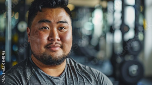 A man with a beard wearing a gray shirt standing in a gym with weights in the background.