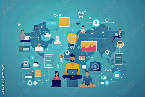 A man with a laptop surrounded by people and icons