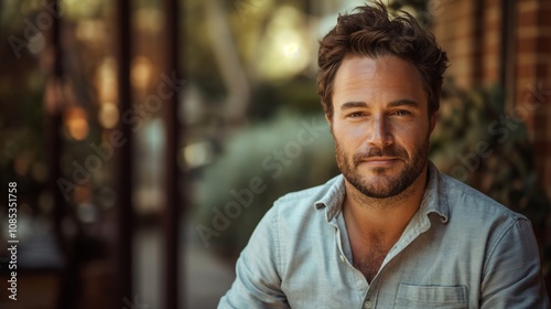 A man with a relaxed expression sits outdoors, enjoying the warm sunlight and greenery