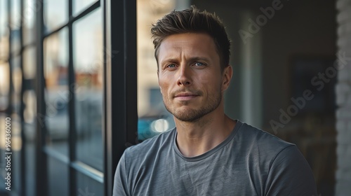 A man with blue eyes and a beard looks at the camera, standing by a window.
