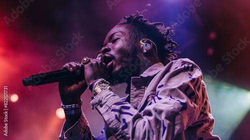 a man with dreadlocks on his head singing into a microphone on stage with lights behind him
