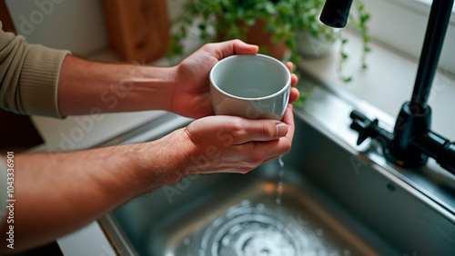A man's hand holds a cup and washes it in the sink of his modern kitchen, close-up view from above. The focus is on the hands. No faces should be visible. A cozy home atmosphere.