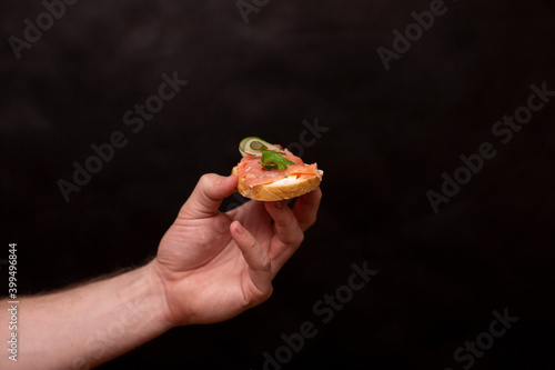 a man's hand on a black background holds a sandwich with a red fish