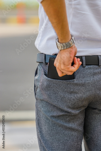 A man's hand with a black leather belt is putting a black leather wallet into his trouser pocket.