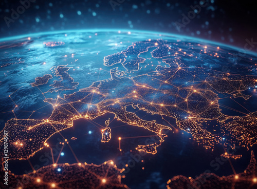 A map of Europe features glowing connections highlighting major cities and networks that reflect digital communication and technology trends