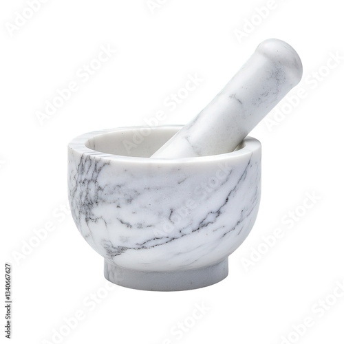 A marble mortar and pestle, featuring a smooth surface with elegant veining, used for grinding and mixing ingredients, Transparent Background.