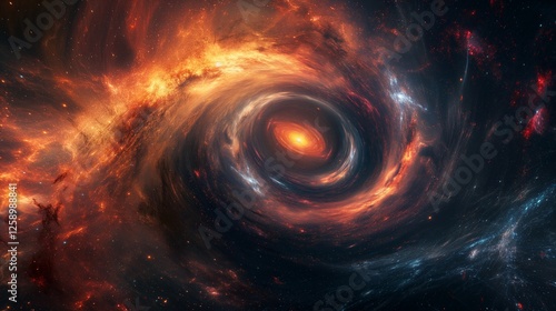 A massive black hole consumes galaxies, swirling fiery matter, distorting space-time, contrasting darkness with cosmic light in a breathtaking celestial event.