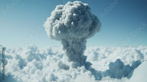 A massive mushroom cloud rises from a field of clouds under a clear blue sky, depicting a nuclear explosion.