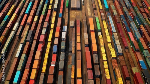 A massive shipping container yard, viewed from above, organized rows of containers in different colors, efficiency in shipping
