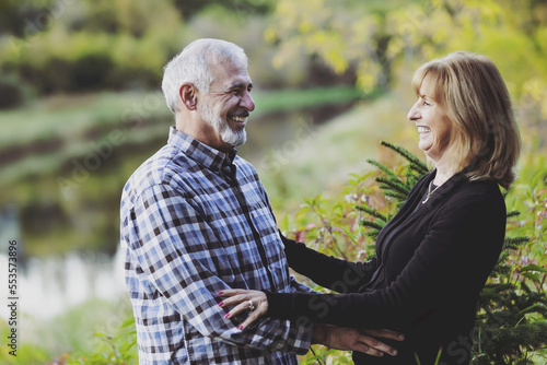 A mature couple enjoying quality time together and stopping to hug, while walking along a river in a city park on a warm fall evening; St. Albert, Alberta, Canada