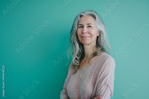 A mature woman with flowing gray hair smiles confidently against a turquoise background, exuding wisdom and positivity.