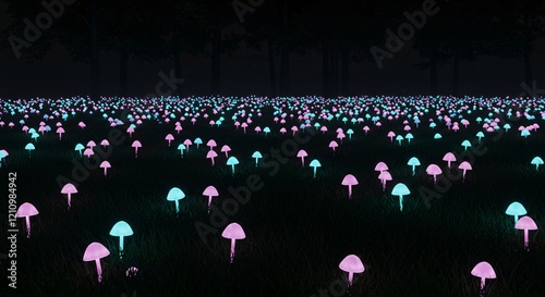 A meadow filled with luminous mushrooms glowing softly in the dark