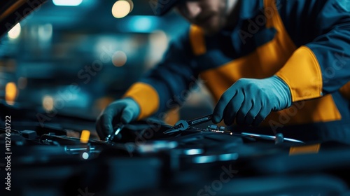 A mechanic works diligently on a car engine in a well-equipped garage, showcasing expertise and attention to detail.