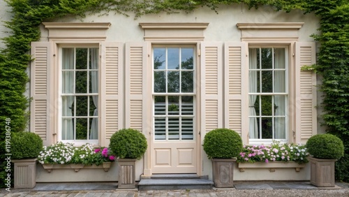 A medium closeup capturing the subtle elegance of wooden shutters painted in a soft hue perfectly fitted to a Georgian homes tall windows framed by meticulously maintained flower