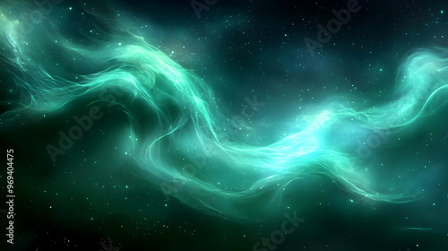 A mesmerizing cosmic scene with swirling green and blue light against a starry backdrop.
