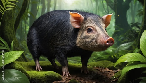 A mesmerizing depiction of a pygmy hog in its lush, verdant tropical habitat. This digital artwork showcases the hog's unique features and the vibrant biodiversity of its environment.