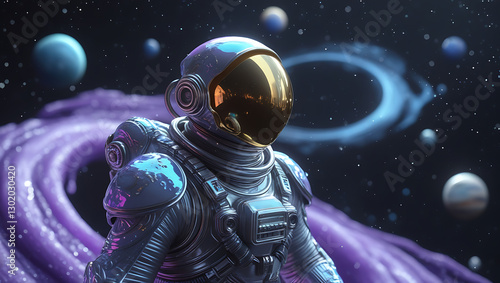A mesmerizing, hyper-realistic visual representation of an astronaut alien in the space, intriguing, mystery, dark theme, majestic, galaxy, planets, created by generative ai