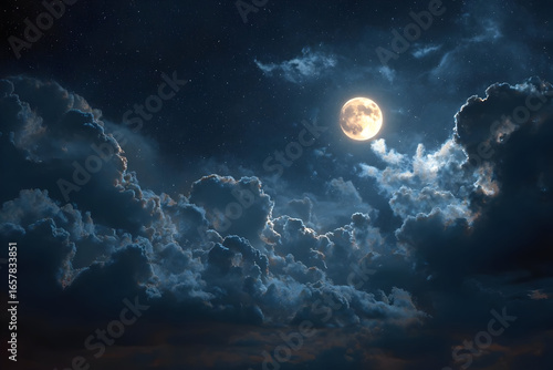 A mesmerizing night sky illuminated by a full moon, surrounded by dramatic clouds drifting across the starlit backdrop. Perfect for serene and contemplative scenes.