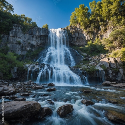 A mesmerizing waterfall cascading over crystal-clear rocks with a pure blue sky.