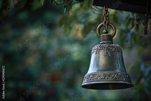 A metal bell hangs from a tree branch, surrounded by greenery and possibly in a forest setting