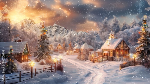 A metallic 3D image in ultra-high definition, portraying a realistic, landscape-format Christmas background with a village covered in snow