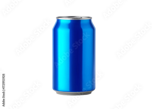 A metallic drinks can standing upright on a white background, isolated and highly detailed. The aluminum surface features realistic reflections and condensation droplets, emphasizing its cold and refr