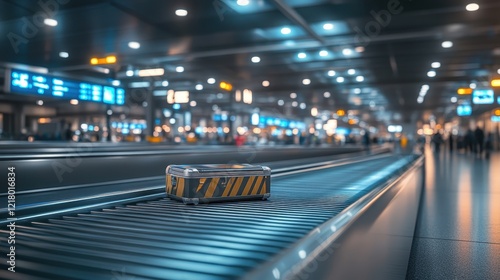A metallic suitcase sits on an airport baggage carousel. Illustrates travel, baggage claim, and transport themes.