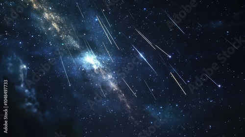 A meteor shower lighting up the night sky, with bright streaks of meteors falling through a dark sky filled with stars