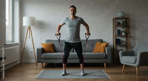 A mid-30s man working out at home using resistance bands. Living room setting with modern minimalist furniture, focus on convenience and strength.