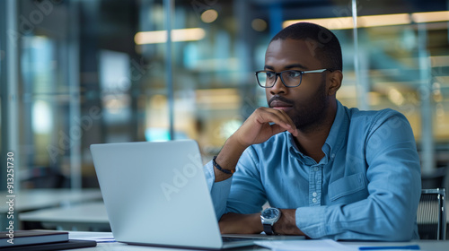 A middle-aged African-American businessman with glasses and a beard sits at his computer looking seriously at the monitor,