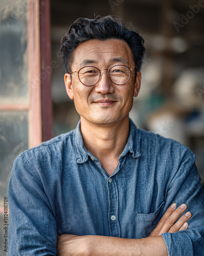 A middle-aged man wearing round glasses and a denim shirt stands confidently with arms crossed, smiling gently in a softly lit indoor setting.